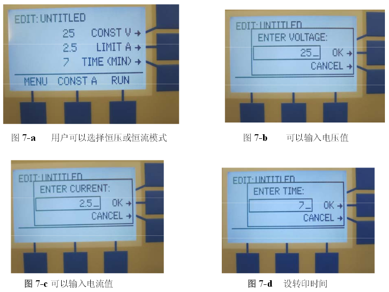 在此界面,用户可以输入电压值(图7-b),电流值(图7-c),和转印的时间(图7-d):
