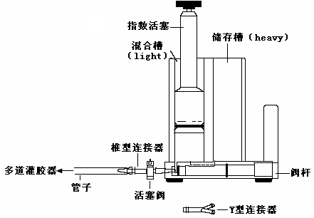 灌制凸形指数梯度胶时,在混合槽(标有light)中的溶液的体积为总体积的1/4(很小10ml),在储存槽(标有heavy)中的溶液的体积与胶的总体积相同(很小40ml)。