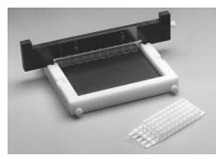 4. 待电泳缓冲液到达设置的温度后,将加好样的凝胶连同底座一起放入电泳槽内的黑色方框内,并保证电泳缓冲液超过胶面1-2mm,盖好电泳槽盖。