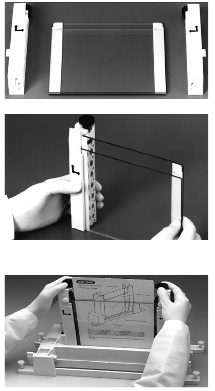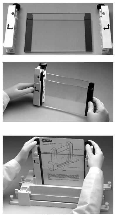I.把三明治结构垂直的放置于桌面上。把梳子垫圈架上的螺丝旋松到头。在螺丝上中间位置用记号笔作一箭头标记。使梳子垫圈螺丝和长玻板朝向自己,把梳子垫圈架放置于三明治顶部,正确放置梳子垫圈架,使其与两边垫片互补。旋紧螺丝,使其刚好接触玻板,然后再旋紧螺丝1/4圈。
