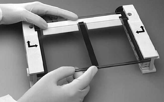把中间的垫条插入三明治结构中间使其处于梳子凹口中间。中间的垫条底部也应与玻板底部齐平。注意:16×16cm胶的梳子是单孔的,不需要中间的垫条。