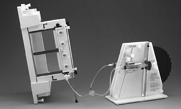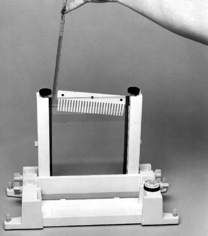 O.用倾斜杆把三明治结构及制胶台倾斜放置。灌制7.5×10cm胶时,调整倾斜杆的高度至杆的很高刻度线,灌制16×16cm胶时把倾斜杆高度调制很低。