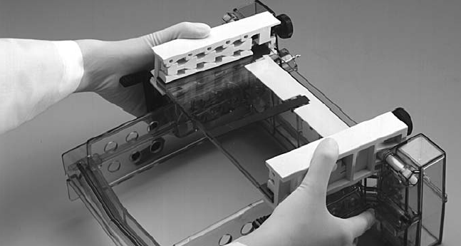 c.把温度控制模块放在Dcode盖架上。把电泳芯和三明治结构放入缓冲液槽中,红色按钮朝向右手边,黑色按钮朝向左手边。把温度控制模块放在电泳槽上面。
