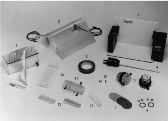 1样品收集器,2Rotofor安全盖,3Rotofor电泳仪基座,4冷却陶瓷芯,5阴阳电极,6O型垫圈,7离子交换膜(电极膜),8电极封盖,9密封圈,10聚焦核心膜,11聚焦室,12聚焦室密封圈,13收集管架