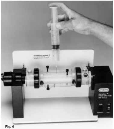 13 重新打开主机,当聚焦槽旋转到加样面(带凹槽,加样小孔)冲上时停止旋转,用一注射器把样品注入聚焦槽腔体,样品会通过一个加样孔弥散到整个腔体,图6。标准型可加40-55ml,迷你型加18-20ml