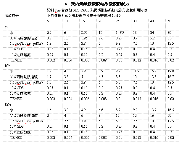 常用聚丙烯酰胺凝胶电泳凝胶的配方见下