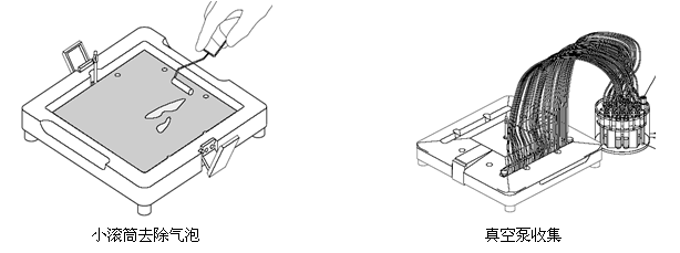 3.将预先剪好尺寸的玻璃纸(或透析纸)用洗脱缓冲打湿,放在滤纸上。用小滚筒(随机附件)去除气泡