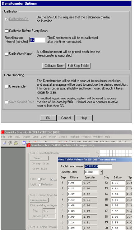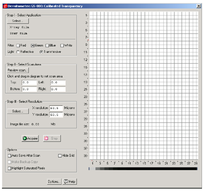 为保证结果的正确性和可重复性,GS-800可以自动的校正扫描图像的密度。当第一次使用GS-800时,必须选择一些设置来进行正确的校正。在主获取窗中点击Options按钮,打开Densitometer Options对话窗口。