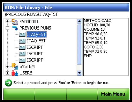 C.打开文件库选择程序:点击主菜单中的Files打开文件库并选择一个流程。点击RUN或ENTER键运行所选择的流程。
