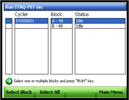 当超过一个Block连接在仪器上时,要选择某个或多个BLOCK进行运行。首先通过点击箭头键选择一个Block并点击Select Block。然后同点击箭头键选择下一个Block并再次点击Select Block。