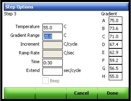 开Options窗口。点击阿拉伯数字键输入梯度范围。点击Done继续。在温度梯度显示框中可以预览温度梯度。
