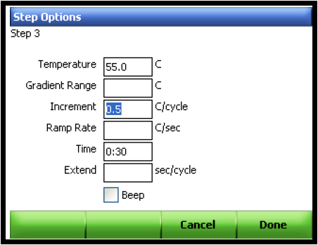 C.增加或删除温度递增功能:选择某一温度步骤,点击Options打开Options窗口,点击箭头键选择Increment窗,输入递增的温度值,点击OK完成。