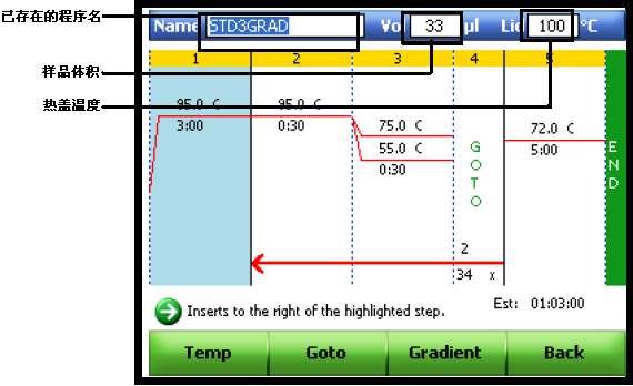 B.增加和删除温度梯度:选择某一个流程步骤,选择Options,或点击Insert及Gradient,选择温度步骤,点击Options打