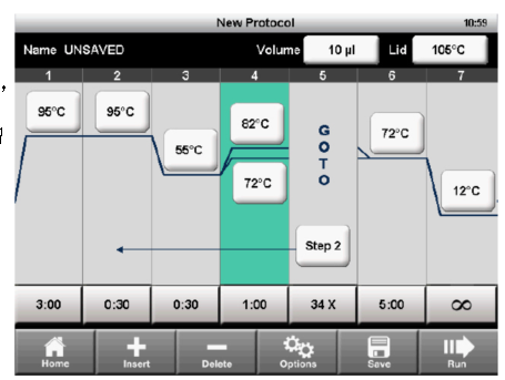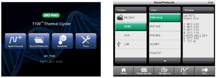 3.点击New Protocol或 Saved Protocol键:新建或在文件库中选择程序。点击RUN开始运行。